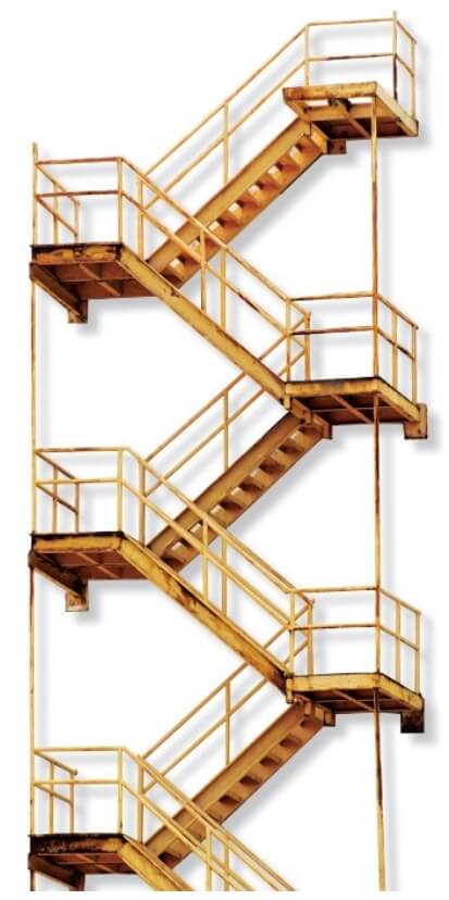 บันไดหนีไฟ ทางหนีไฟ เครื่องหมาย และไฟป้ายบอกทางฉุกเฉิน ผู้ตรวจสอบจะดำเนินการตรวจสอบครอบคลุมอย่างน้อย ดังนี้